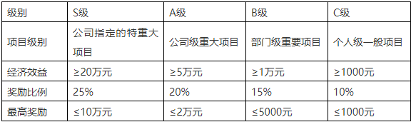 公司推行項(xiàng)目改善從質(zhì)量、成本、生產(chǎn)、交付、安全、設(shè)備改進(jìn)、團(tuán)隊(duì)及技術(shù)改善類(lèi)等方面推進(jìn),不斷完善制度流程化建設(shè),同時(shí)建立獎(jiǎng)勵(lì)機(jī)制,按改善項(xiàng)目重要等級(jí)分S級(jí)、A級(jí)、B級(jí)、C級(jí),按級(jí)別比例進(jìn)行最高獎(jiǎng)勵(lì)。