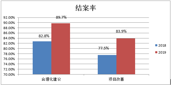 今年截止9月份,合理化建議共接收并被采納39項(xiàng),結(jié)案35項(xiàng),4項(xiàng)還在如期進(jìn)展中,結(jié)案率89.7%,改善項(xiàng)目立項(xiàng)31項(xiàng),結(jié)案26項(xiàng),5項(xiàng)在如期進(jìn)展中,結(jié)案率83.9%。同比去年的合理化建議結(jié)案率82.8%和項(xiàng)目改善結(jié)案率77.5%提升不少。