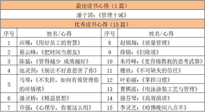 本次為2019年第三季度讀書心得評選活動,經總裁辦校對、審核,從100多篇心得中初選出30篇,再根據(jù)主題明確、立意新穎、結合工作實際、文字通順完整等篩選出16篇優(yōu)秀心得,其中獲得本季度“最佳讀書心得”得主品質部潘于清的《管理十誡》評選。最佳及優(yōu)秀文稿如下: